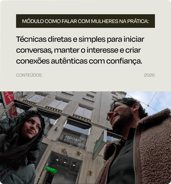 Não se trata apenas de abordar mulheres, mas de transformar como você se relaciona com o mundo. Você terá em mãos técnicas comprovadas e fáceis de aplicar, que funcionam em qualquer contexto.